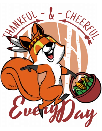 A cartoon fox holding a basket of corn, with a forest background and the text 'Thankful & Cheerful Every Day' in pink.