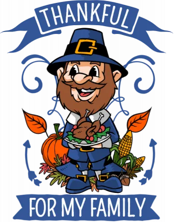 A cartoon pilgrim with a turkey and cornucopia, expressing gratitude for family.