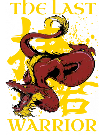 A cartoon-style illustration of a warrior with a Chinese character and a red dragon, set against a black background.