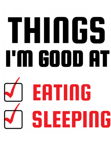 A simple design with the words 'EATING' and 'SLEEPING' in red, with two red check marks on the left side.