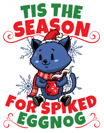 A cartoon cat wearing a Santa hat and holding a mug with the words 'Tis the season for spiked eggnog.