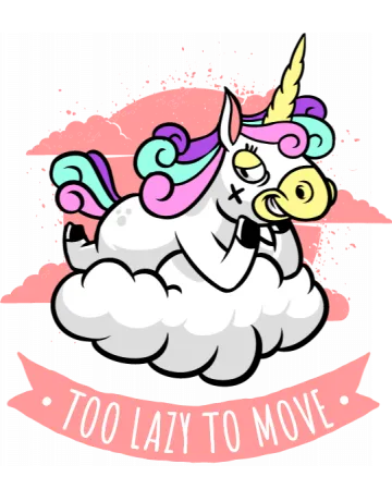 A cartoon unicorn with a lazy expression and the words 'Too Lazy to Move' written below it.