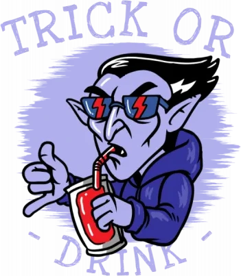 A cartoon vampire drinking a red beverage with a straw, surrounded by the words 'TRICK OR DRINK'