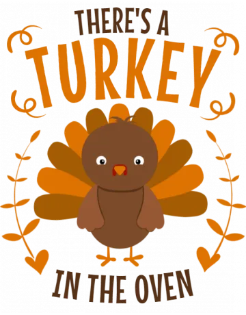 A cartoon turkey with the words 'There's a turkey in the oven' in a playful font