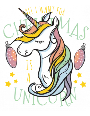 A cartoon unicorn with a rainbow mane and the words 'ALL I WANT FOR CHRISTMAS IS A UNICORN' in green and yellow text.