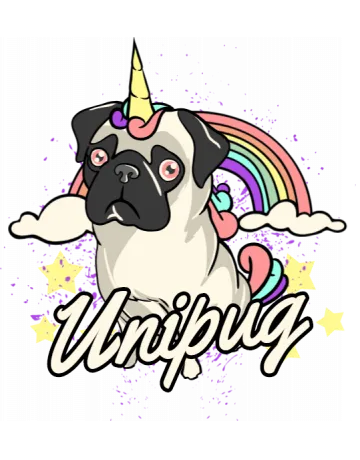 A cartoon pug with a unicorn horn, rainbow, and stars.