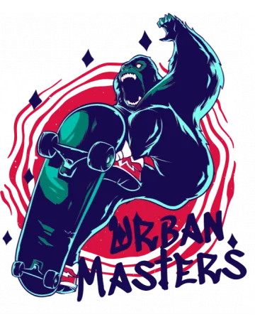 A cartoon gorilla riding a skateboard in front of a red and black swirl, with the words 'URBAN MASTERS' written in purple graffiti-style letters.
