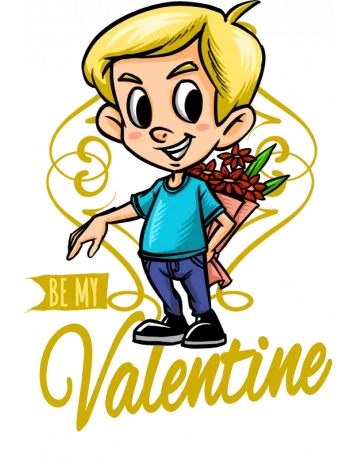 A cartoon boy holding a bouquet of flowers with the text 'Be My Valentine' in yellow script.