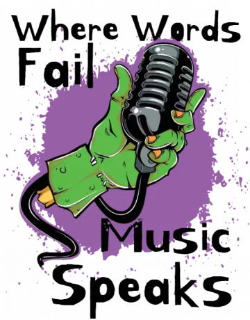 A cartoon green hand holding a microphone with the word 'Music' written in a stylized font.