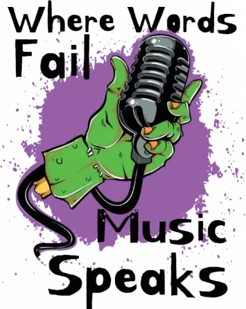 A green cartoon hand holding a microphone with the word 'Music' in the background.