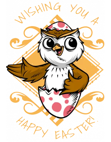 An owl wearing a polka dot Easter egg as a hat, with a message wishing you a Happy Easter.