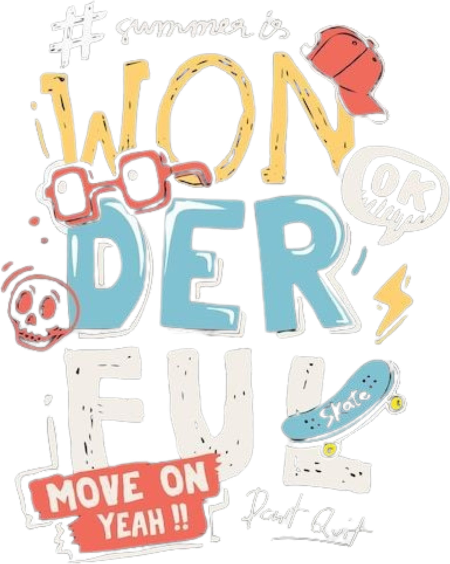 A t-shirt design featuring the words 'WONDERFUL' in various colors and sizes, with a pair of sunglasses, a hat, a skateboard, and a skull.