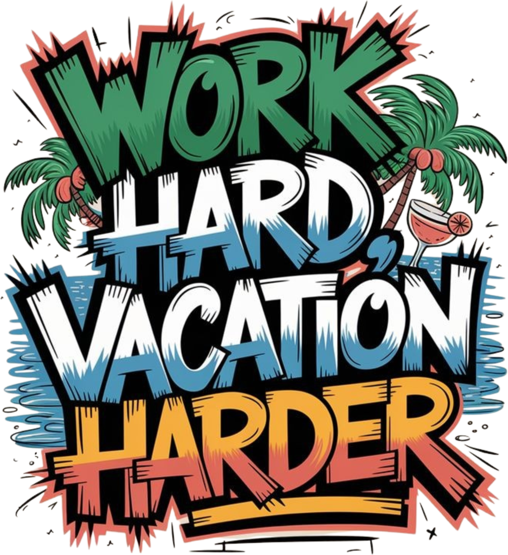 A t-shirt design with a tropical theme, featuring a palm tree and a cocktail glass, and the phrase 'Work Hard Vacation Harder' in a playful, colorful font.