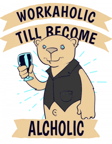 A cartoon bear holding a glass of wine with a banner saying 'Workaholic till become Alcholic'