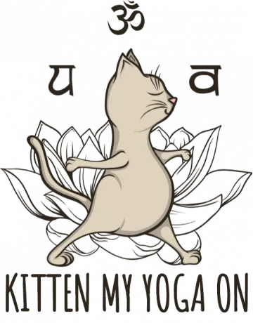 A cartoon cat in a yoga pose with a lotus flower and Om symbol.