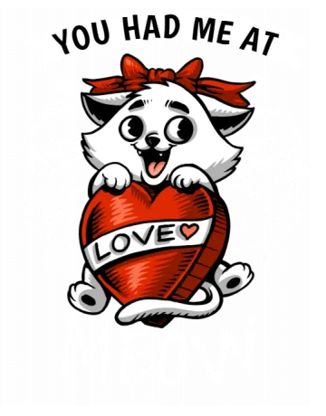A cartoon cat holding a heart with the words 'you had me at meow' written above it.