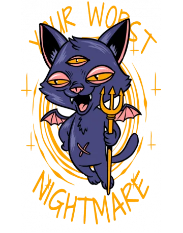 A cartoon cat with yellow eyes and a trident, surrounded by the words 'YOUR WORST NIGHTMARE' in yellow text.